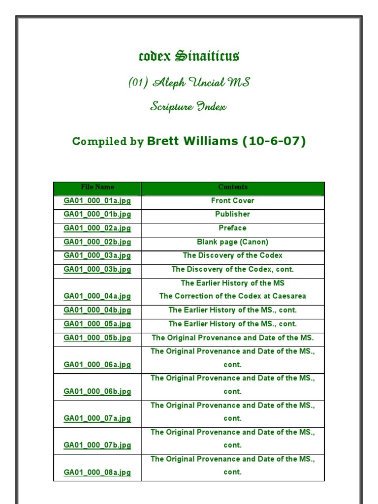 Codex Sinaiticus 01 Scripture Index Bible Versions And